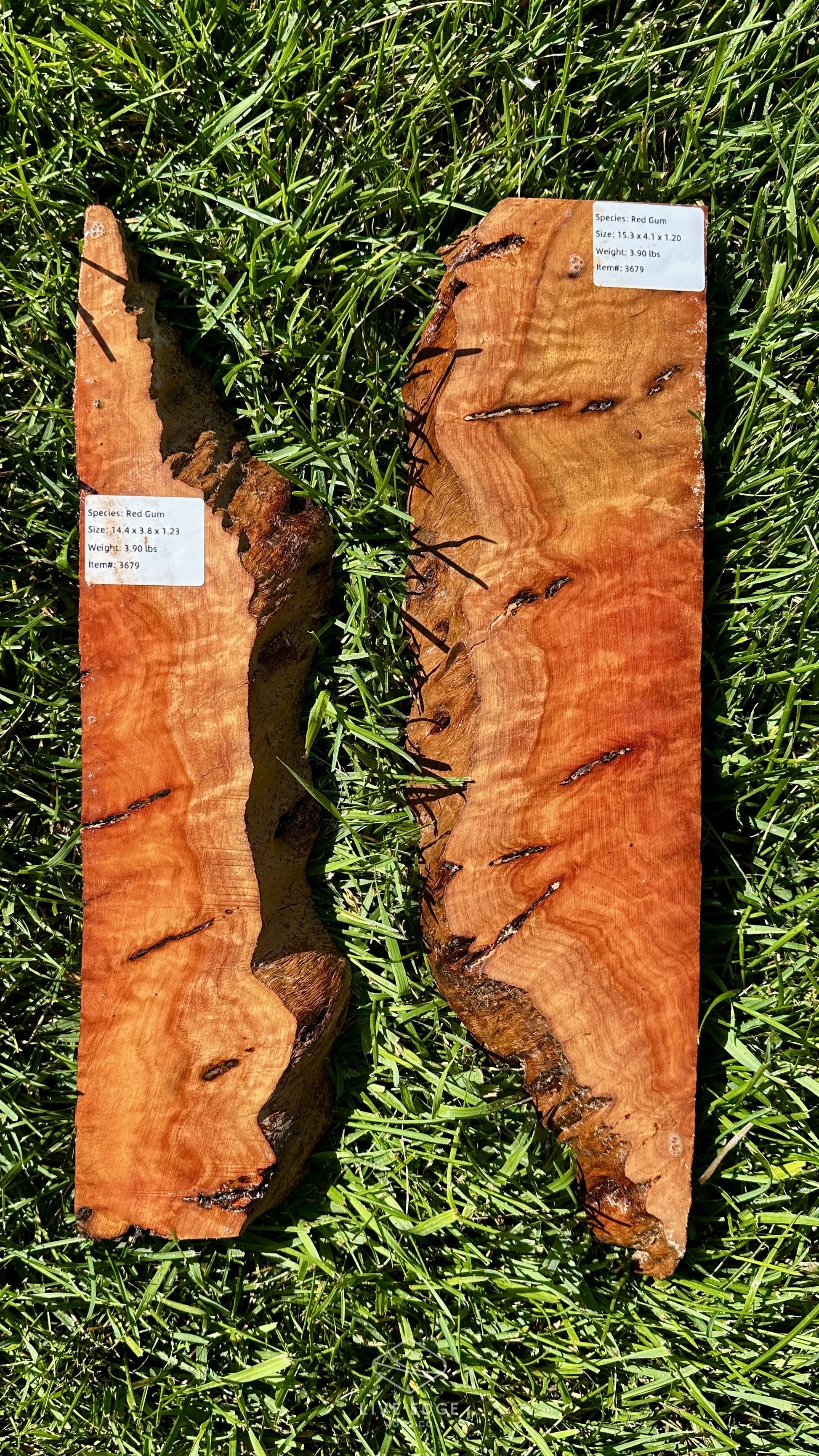 Premium Highly Figured Red Gum Burl Set Size: 1@14.4"x3.8"x1.23" and 1@15.3"x4.1"x1.2"